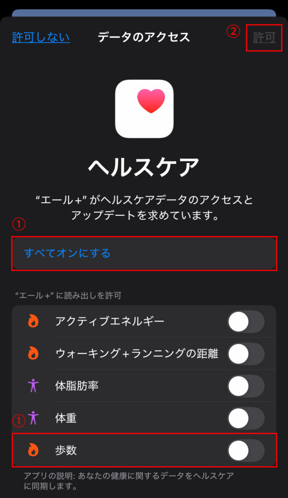 2.データへのアクセス画面が表示されるので「すべてオン」をタップ、または「歩数」を有効にして「許可」をタップしてください。