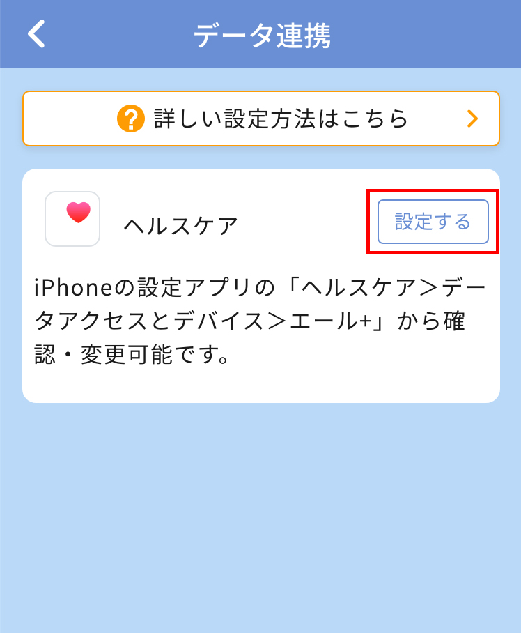 9.再度、エール+アプリを開きヘルスコネクトの「設定する」をタップします。