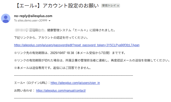 従業員は本文のURLからアカウント有効化を行ってください。必要情報を入力し設定を完了してください。