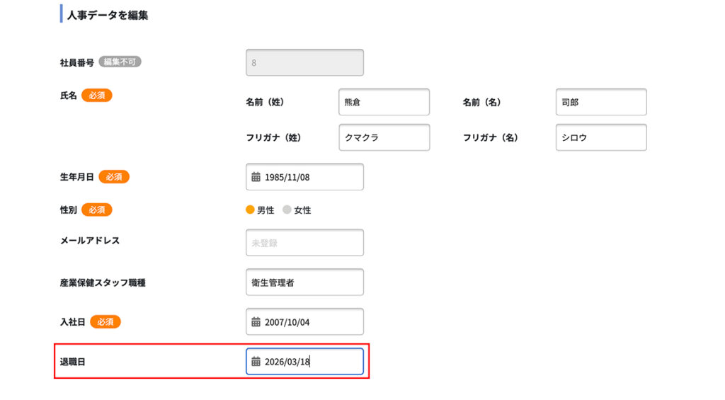 退職日を登録した場合、当該データは削除されずエール+に保持されますが非表示状態となります。健診結果一覧などにはデフォルトで表示されません。