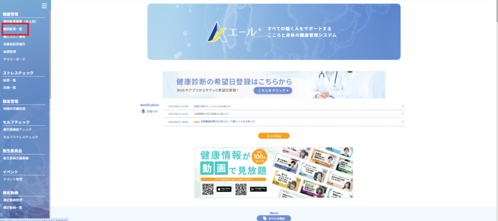 左側のメニューより、健康管理>「健診結果一覧」を開きます。​