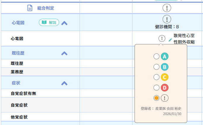 産業医・保健師の判断において判定をつけていただく為にシステム上、未判定(!)と表示しております。