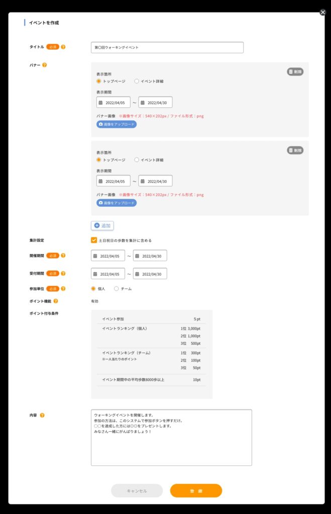 開催期間中が土日を挟む場合、土日の歩数を集計するかどうかを選択できます。 - 開催期間