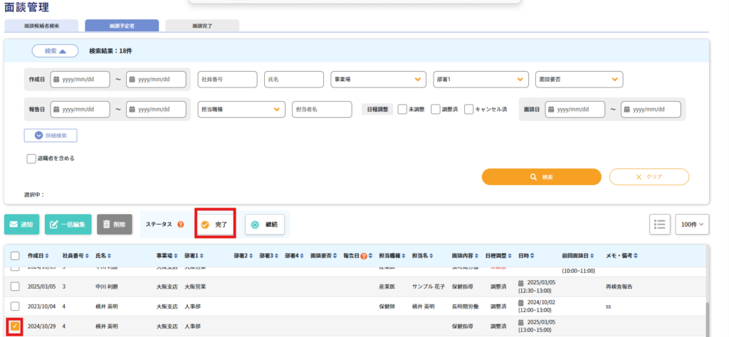 ステータスを変更したい面談にレ点を付け、「完了」ボタンを押します。