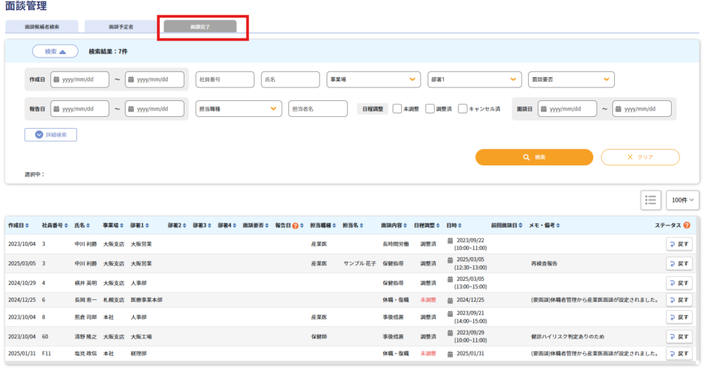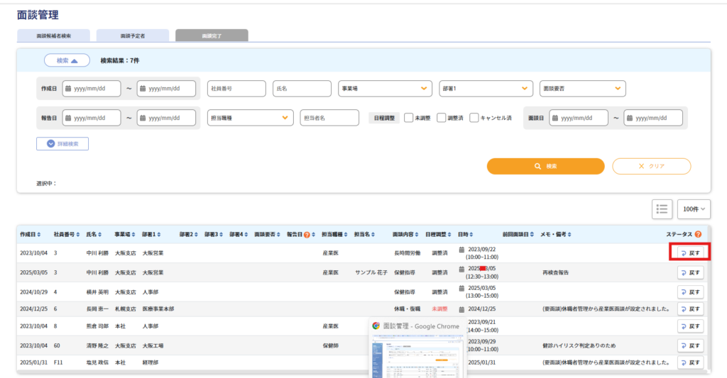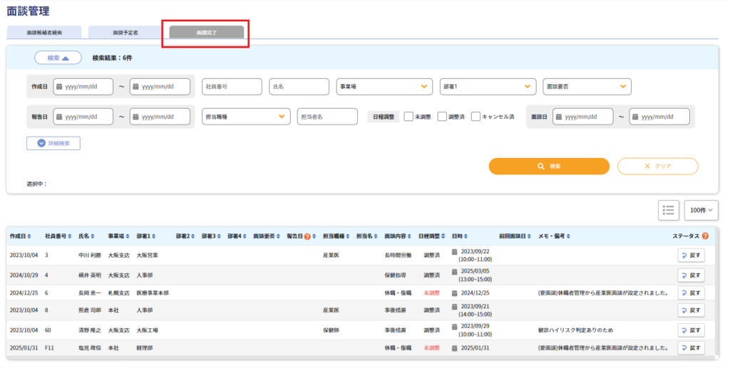 なお、「面談完了」タブの「戻す」ボタンを押すと、面談が「面談予定者」タブに戻ります