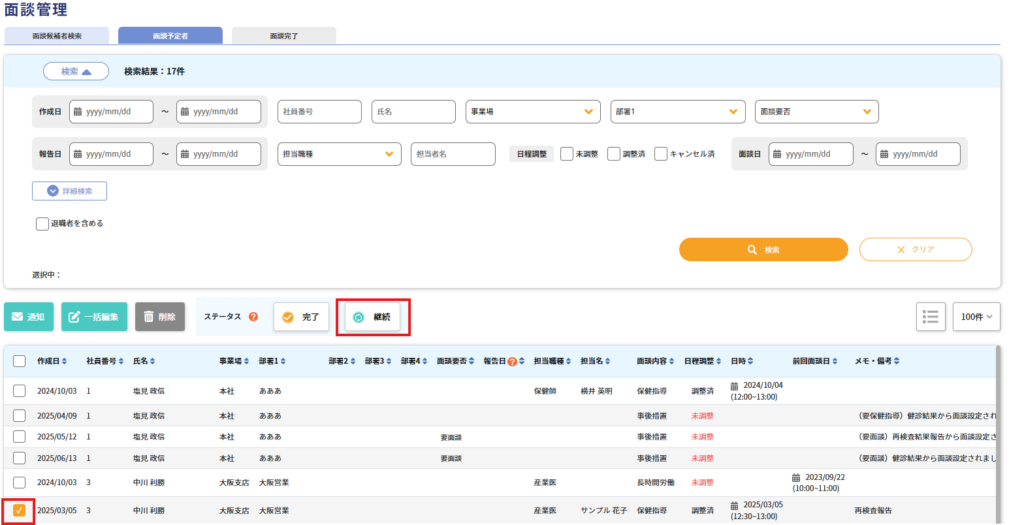 「継続」にした場合は、選択した面談が「面談完了」タブに移動し、「面談予定者」タブに新規面談が追加されます。(選択したものを複製した内容が新規追加されます)