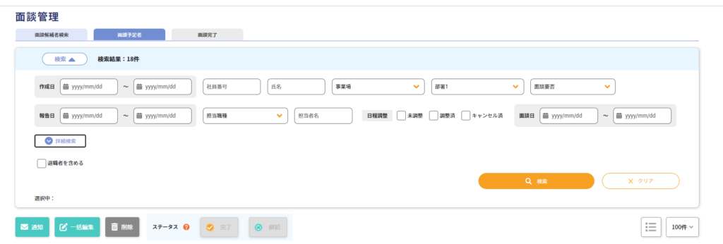 面談が完了した場合、ステータスを「完了」に変更すると、「面談完了」タブに選択した面談が移動します。