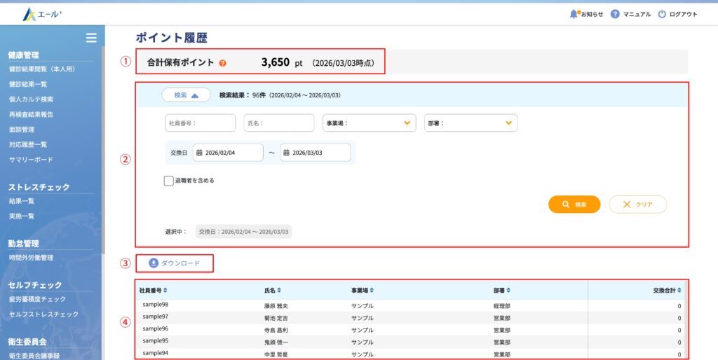 ユーザーのポイント交換履歴をCSV形式でダウンロードすることができます。
