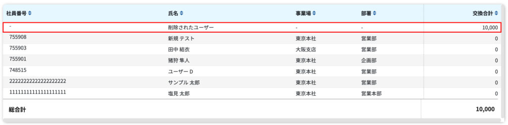 本画面をシステム管理者権限を有するユーザーが確認した場合、人事データ上で削除処理が実施されたユーザーは、表示名が「削除されたユーザー」となり、社員番号および所属は「-」と表示されます。