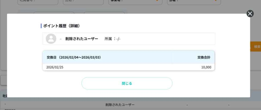 ユーザーの名前をクリックすると、いつ、何ポイント交換したか履歴の詳細を確認できます。
