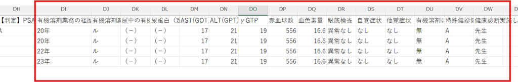 • 個人カルテ画面:特殊健診の列が作成され追加した項目名と結果内容は「その他」の欄に表示されます。