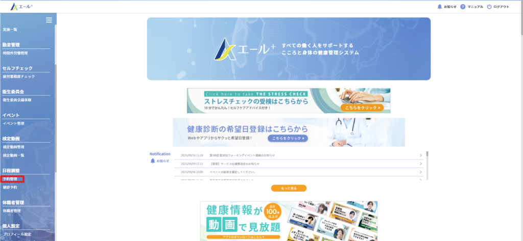 受付を開始すると、健診対象の従業員にバナーが表示されます。