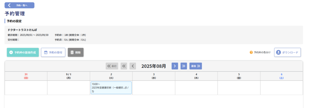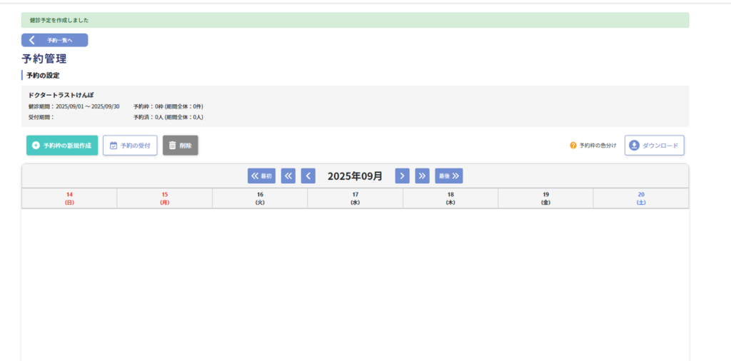 次に健診の予約枠を作成します。「予約枠の新規作成」をクリックします。