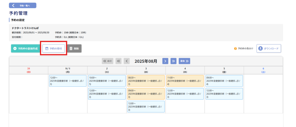 予約枠を作成し終えたら、受付を開始します。「予約の受付」をクリックします。