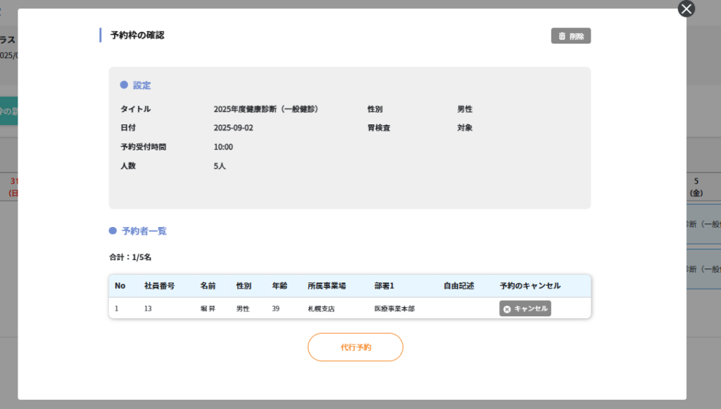 右上の「削除」ボタンをクリックすると予約枠を削除することができます。