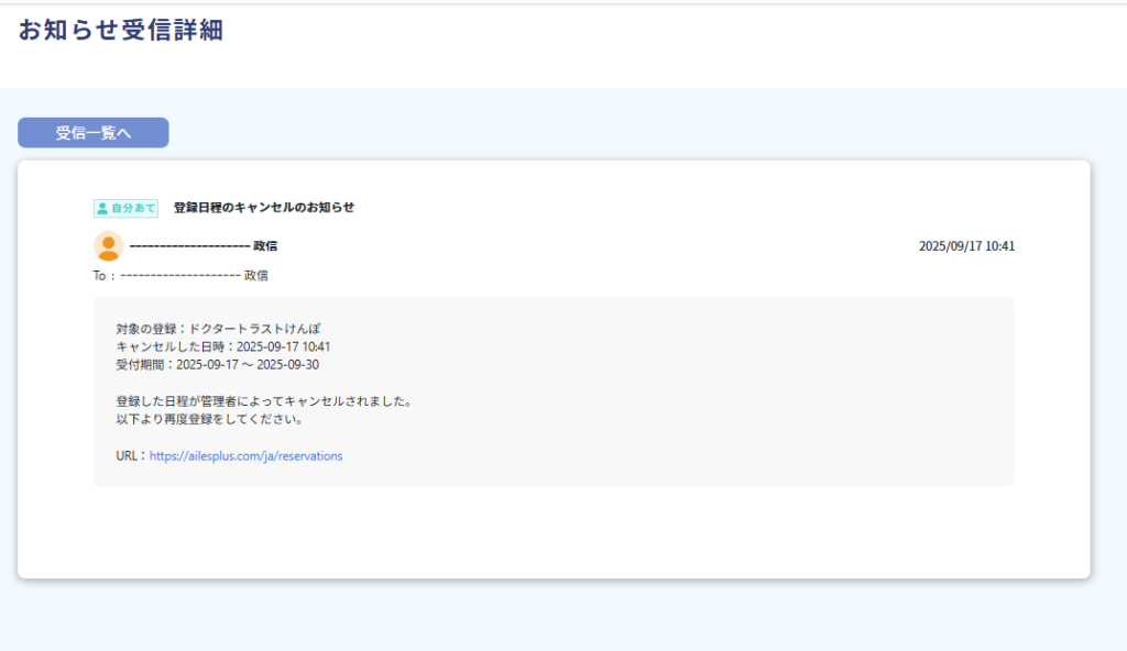 従業員の予約がある場合、予約枠を削除すると、以下のお知らせが従業員に届きます