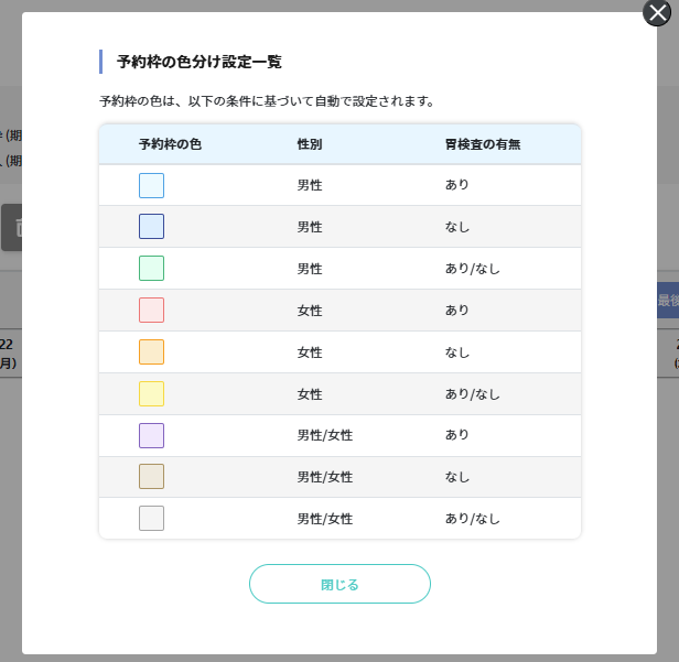 予約枠の色は、下記のように条件別に自動で設定されています。