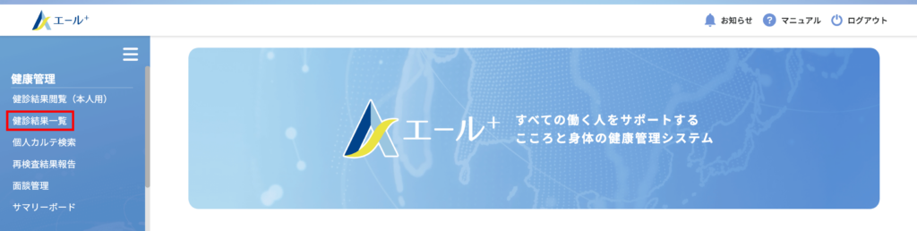 左上のメニュー(またはTOP画面)より、健康管理>「検診結果一覧」を開きます。