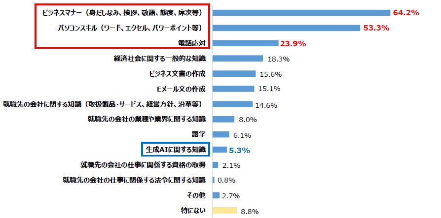一方、近年注目される「生成AIに関する知識」を挙げた企業はわずか5.3%にとどまりました。