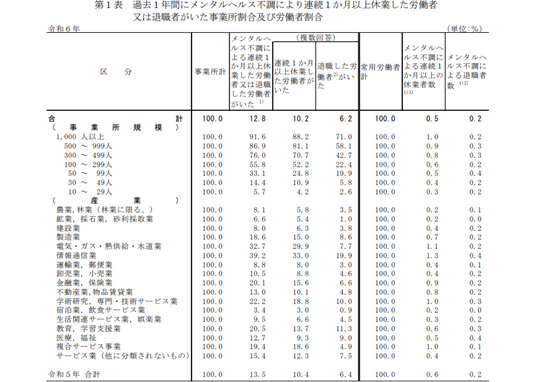 2023年11月1日から2024年10月31日までの期間において、メンタルヘルス不調により連続1カ月以上休業(以下、休業者)した、または退職した労働者がいた事業所の割合は12.8%でした。