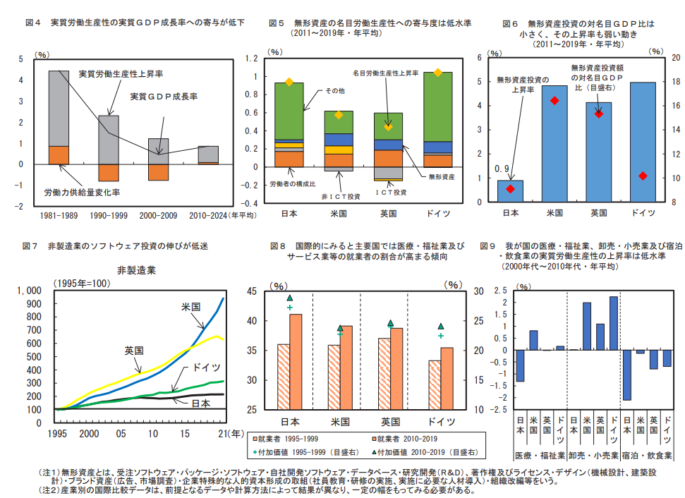 また、米国や英国、ドイツと比較すると、日本は人的資本投資やソフトウェア投資などの無形資産投資の対名目GDP比が小さく、その上昇率も弱い動きとなっています。そのため無形資産が名目労働生産性に与える影響も限定的です。