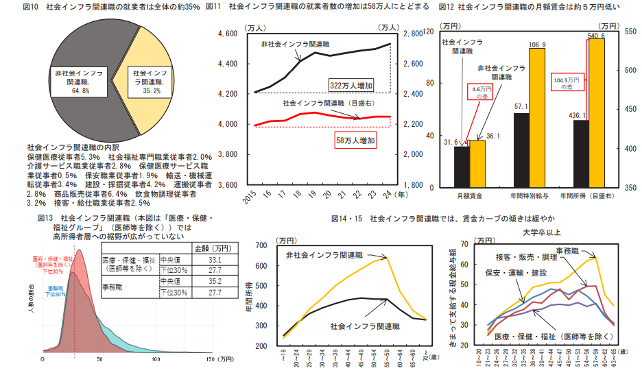 社会インフラ関連職の就業者は就業者全体の約35%となっており、過去10年間をみると、非社会インフラ関連職は322万人増加した一方、社会インフラ関連職の増加は58万人にとどまっています。