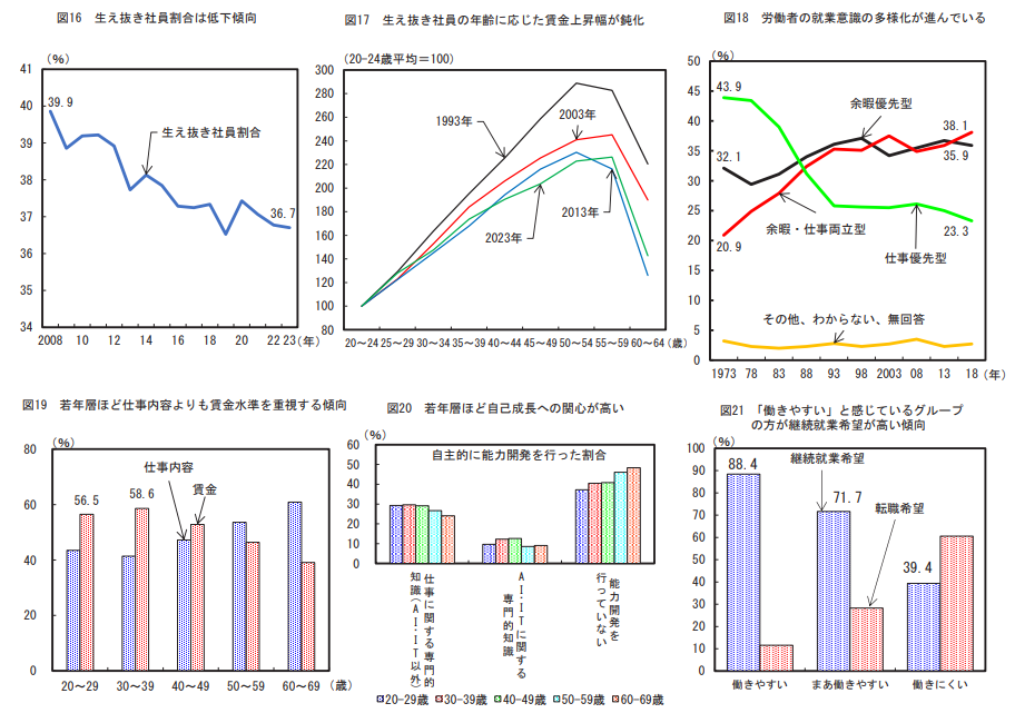 企業と労働者の関係性をみると、転職者が増加するとともに、生え抜き社員の割合は低下していることがわかります。このような日本的雇用慣行の変化に加え、ワーク・ライフ・バランスへの関心の高まりなど、雇用を取り巻く環境にさまざまな変容が生じています。