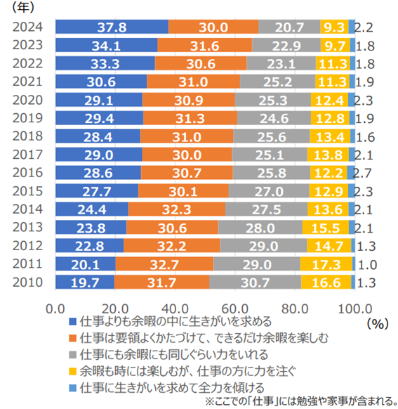本発表からは「仕事より余暇を重視する」人が過去最高を更新するなど、働き方や生活の価値観にも変化が見られています。