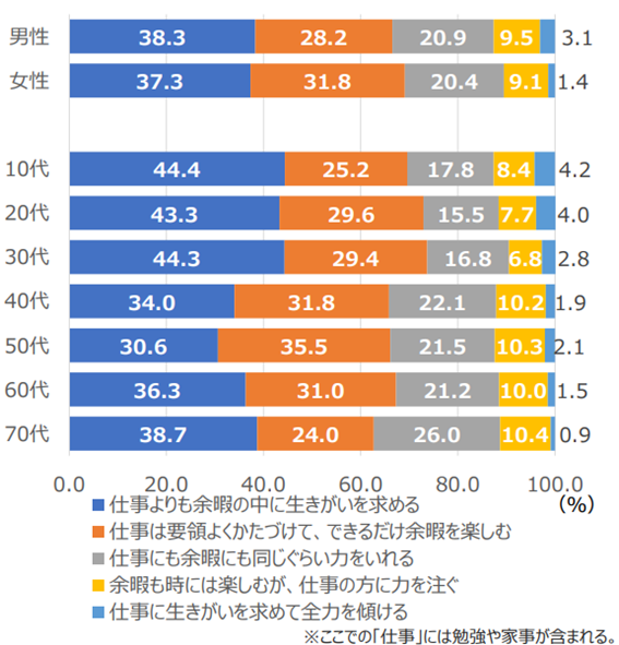 余暇重視派が約7割を占める一方、仕事に生きがいを求める割合も他の年代より高めです。