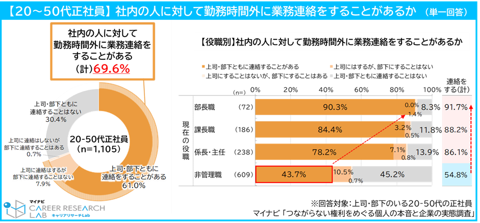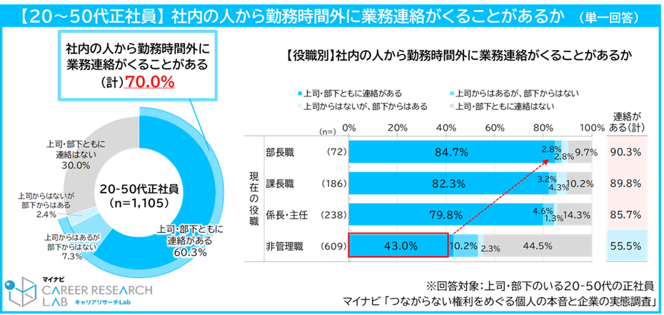 調査によると、「社内の人から勤務時間外に業務連絡を受けている」と回答した正社員は約7割にのぼりました。