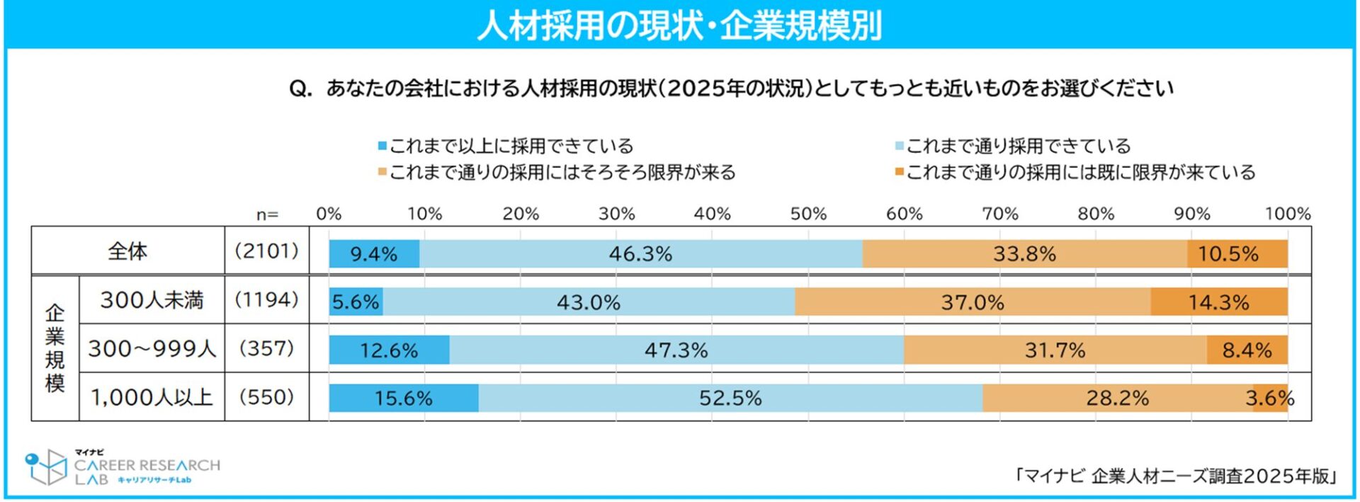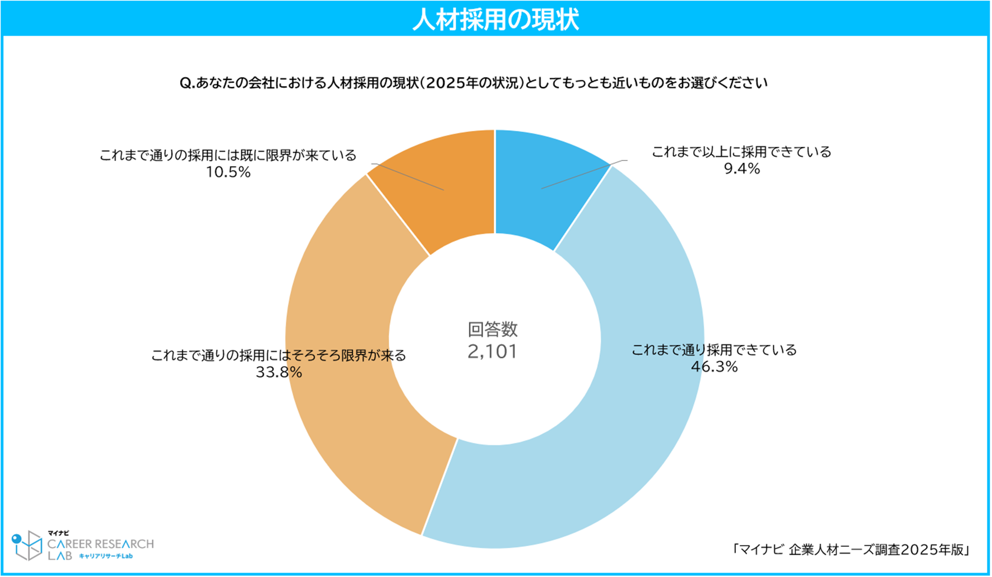 一方で、「これまで通りの採用にはそろそろ限界が来る」は33.8%、「すでに限界が来ている」は10.5%という結果となっています。