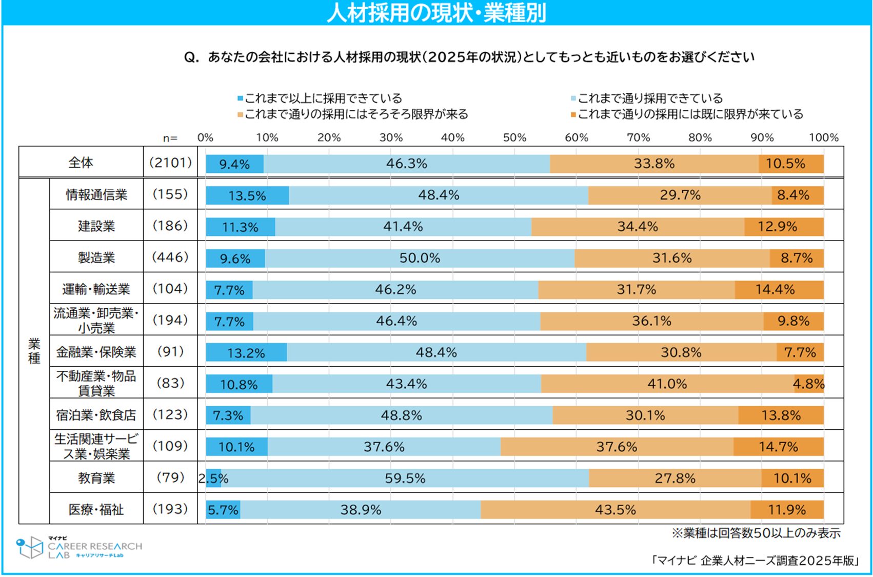 次に業種別で見ると、「医療・福祉」では「そろそろ限界が来る」43.5%、「すでに限界が来ている」11.9%、「生活関連サービス・娯楽業(クリーニング、理美容、娯楽施設)」では「そろそろ限界が来る」37.6%、「すでに限界が来ている」14.7%となっており、半数以上の企業で従来通りの採用が難しくなっている傾向がみられました。
