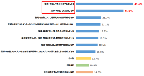 調査結果によると、新入社員や若手社員の育成に関する課題として最も多かったのは、「指導・育成しても会社を辞めてしまう」で49.4%でした。