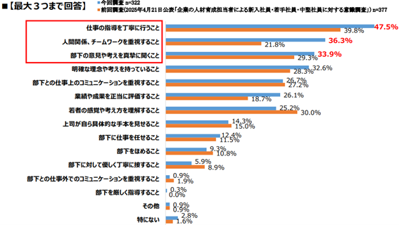 この結果から、新入社員の育成では単に業務を教えるだけでなく、コミュニケーションを重視した指導や信頼関係の構築が重要視されていることがわかります。