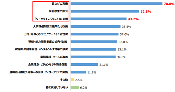 さらに、人材定着のために企業が実施している施策としては、「賃上げの実施」が70.8%で最も多く、次いで「福利厚生の拡充」が52.8%、「ワークライフバランスの支援」が43.2%となりました。