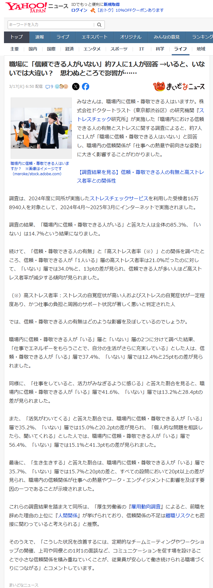 Yahoo!ニュース掲載「職場に信頼できる人が『いない』社員は7人に1人~”ストレス”と”仕事への熱意”に悪影響を及ぼす~」